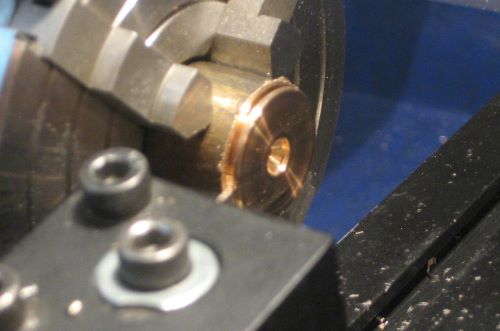 Then the thin disk can be parted off. Torque is limited on a Sherline lathe, so the parting tool is only 0.040 inch thick. It wavers around during parting, so the back side of the washer is uneven.