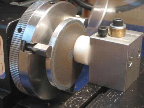 So I decided to sand the back side. Here is an aluminum disk with wet sandpaper glued on, and a Delrin holder for the washer. The face of the holder has a shallow recess to retain the washer.