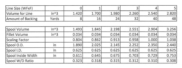 Here are two measurement spools; one is 1.70 cubic inches for a WF1F and the other is 2.54 cubic inches for WF4F (zero backing in both cases).