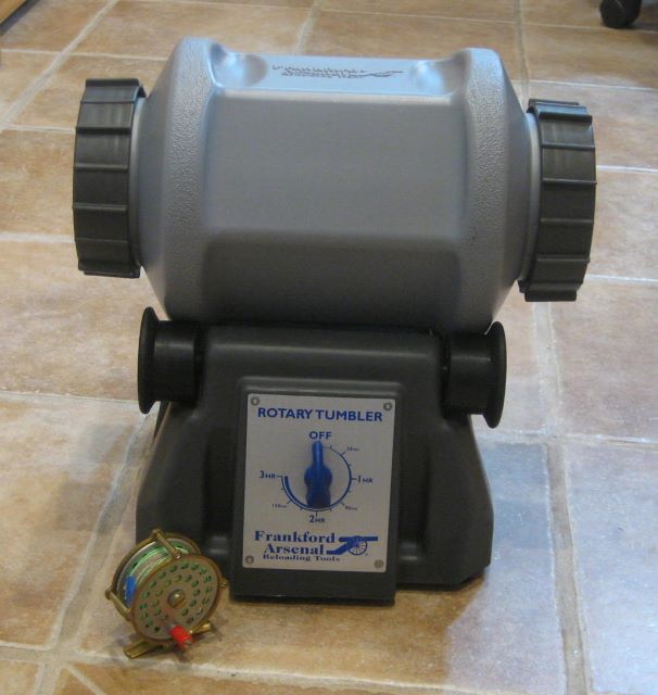 About a year ago, Reelmaker Anders bought a rotary tumbler and told me that it was an improvement over vibratory tumbling. Rotary tumblers are used by ammunition reloaders and jewelry makers. They differ from rotary rock tumblers in that they run at higher speed and use stainless steel media.