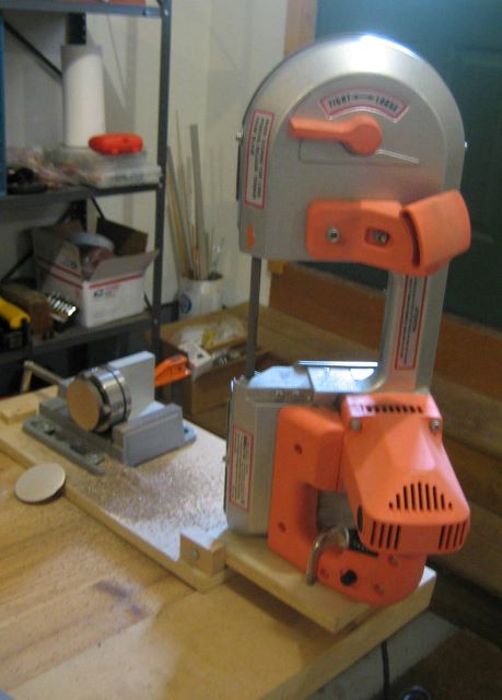 Update 9 July 2015: Using my small bandsaw, I cut 14 disks to make 7 reels. But I also cut a couple of unuseable disks. The wooden guide frame is not rigid enough to keep the blade from wandering if I apply too much hand pressure while making the cut. Also, I found that I was spending a lot of time in squaring up the sawn disks.