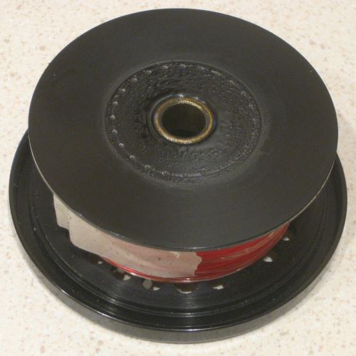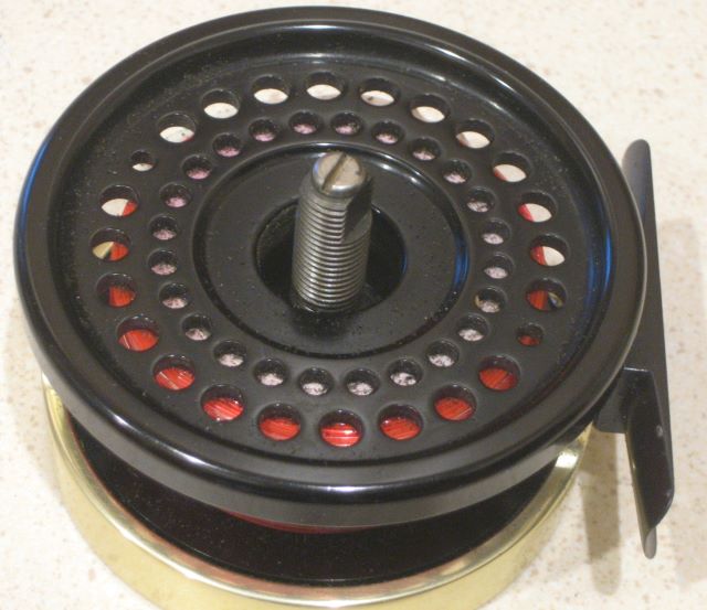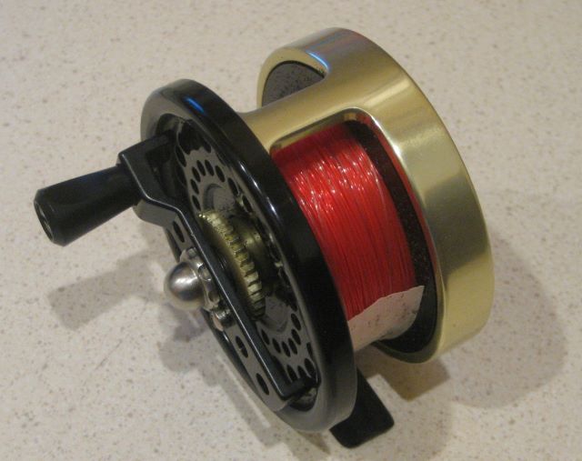 I have borrowed this reel from a friend, who has it loaded with monofilament (?). It is a disc drag reel, more complex than the simple click pawl reels that I make. These are my notes for a possible future design.