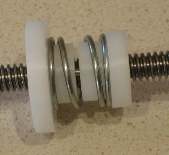 The two nut halves are acetal. They are preloaded at 10 lbf by a spring, and are rotationally locked by axial pins. Acetal allows running without grease lubrication, which would collect the fine dust produced by engraving.