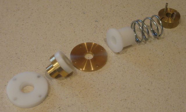 Here are parts of the thrust and radial bearing assembly (l to r): the radial bearing stator, radial bearing rotor and thrust flange (pinned to acetal runner), stationary thrust plate, acetal thrust runner and spring guide, spring, and shaft clamp. The brass flange backing the first thrust runner will bond to the acme screw with Loctite retainer 609.