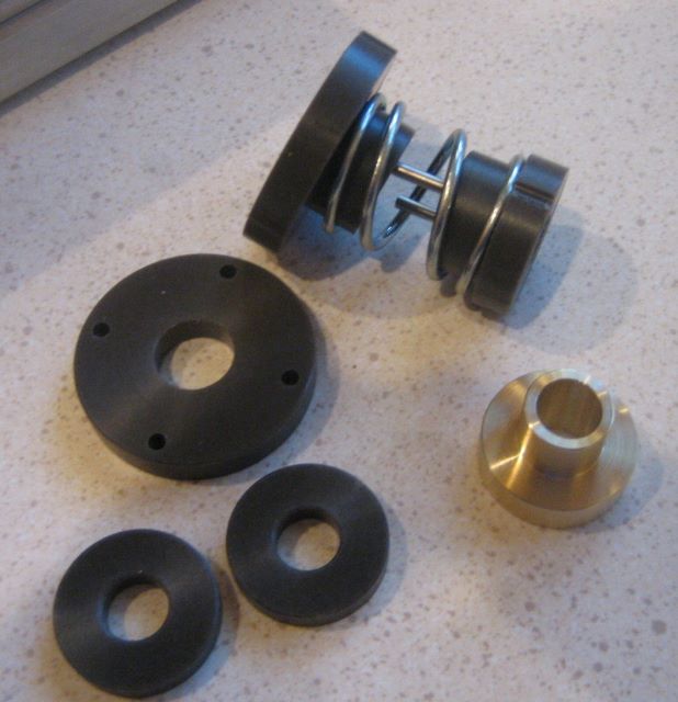 A note on acetal components: when I first tapped the two acme nuts, they each felt like they closely fit the acme screw. This is in contrast to a brass nut, for which the clearance in the standard acme thread can be felt. I believe that the apparent absence of clearance is due to plastic “flash” at all the sharp corners of the thread. During the first few hours of nut operation, this material is turned into loose debris and the nut then has normal clearance. So a spring loaded assembly is needed to obtain zero backlash, despite the initial feel of the plastic nuts.