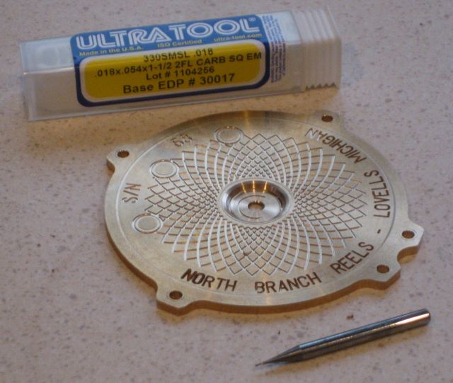 Here I have used a .018 inch diameter square end mill and have aimed for a .005 inch groove depth. The decorative pattern was done first and all was satisfactory to that point. The lettering followed, and that is where the collet grip on the end mill failed. The letters went on clockwise; you can see that N on MICHIGAN looks OK, but after that the groove becomes deeper. By the time it got to the N on NORTH, the groove was nearly .06 deep. I am amazed that a .018 end mill would survive. The material is c544 bronze, a free machining alloy.