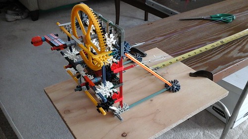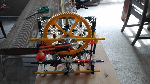 I am not familiar with K’Nex, but it looks as if the input gear here may be several inches diameter. Three high speed furling shafts run 14.2 times as fast as the input crank. (My speed-up ratio is 84/17 = 4.9 .) He also has a fourth spindle with ratio 5.9 .
