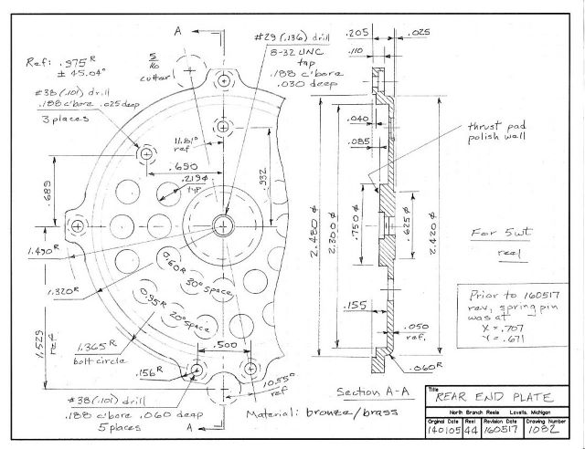 For the 3 weight reel, the ratchet gear is too small diameter to allow a raised thrust pad, as on the 5 weight. So the extra material for spindle threads is on the outside of the plate.