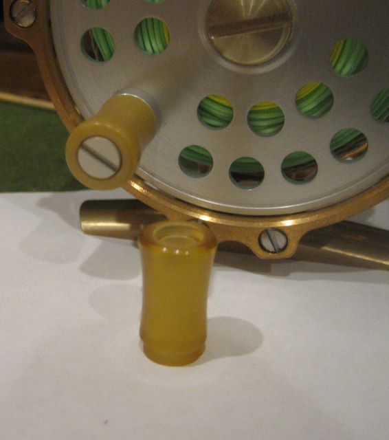 Here is the knob and its mounting hardware. The purpose of the pan is to keep leaders from getting wound around the pin, under the knob.