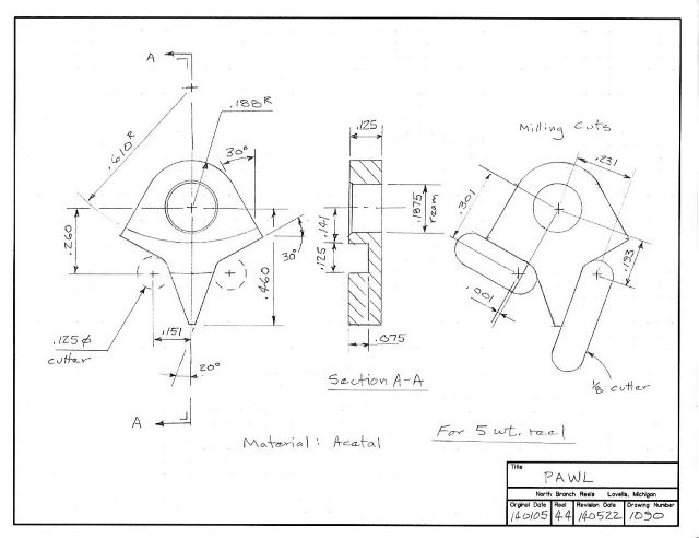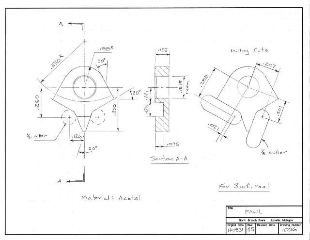 Notice the 20 degree angle on the flanks of the pawl tip. This is the pressure angle of the mating gear. It is not important when the pawl is clicking along in one direction, but it does help the pawl make a smooth reversal of direction.