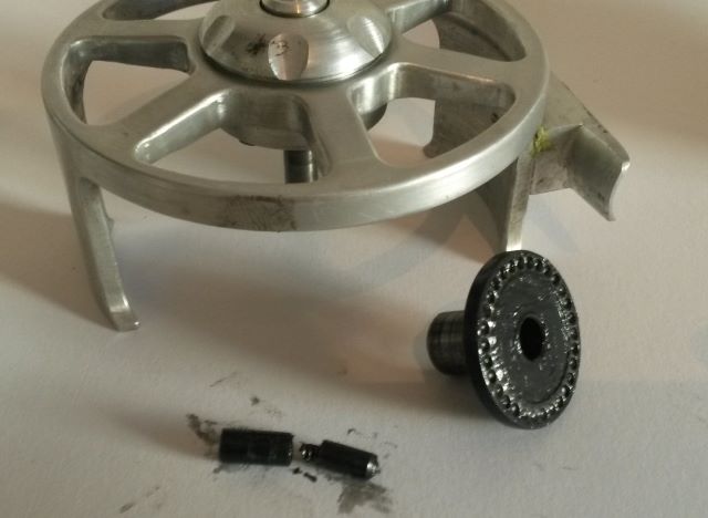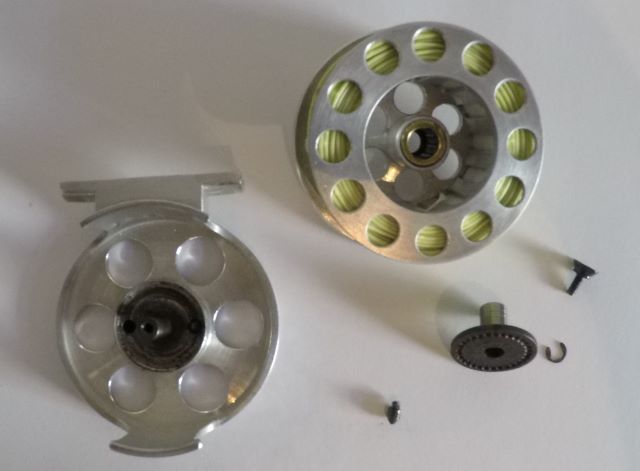 Reel No.3 has an adjustable drag. To achieve this, the described hollow pins and their springs are housed inside a cup, which the drag-adjust-knob presses against, as you tighten or loosen it. This system works well, but it is fiddly to install, the non-hardened pins and wheel are a little prone to wear and the one-way bearing, hollow shaft and wheel amount to some weight. Also the pins demand quite a lot of space in the axial direction, making it slightly difficult to design a slim frame.