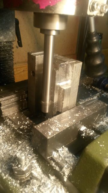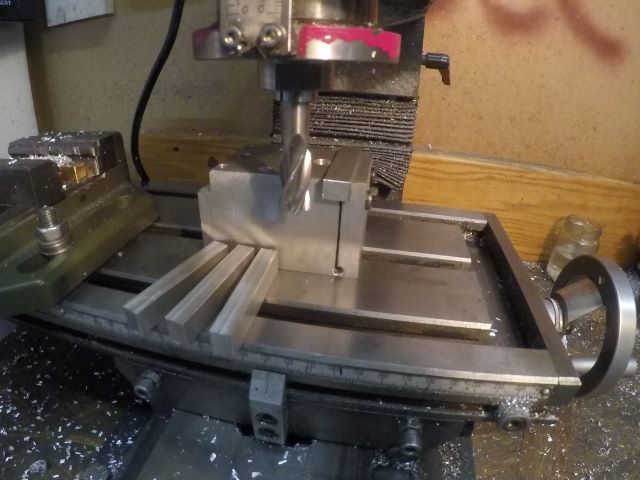 The reel foot blank, after being milled to the correct width, gets clamped in the slot to face off the ends.