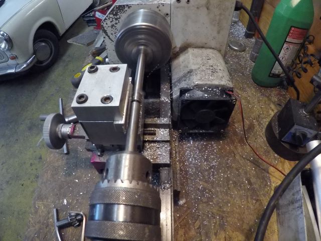 After that, the blank gets clamped in the other fixture which mounts on the lathe cross slide. There the inside radius gets machined with a long fly cutter, which receives support from the tail stock at the rear end. This way the inside radius can be made using the lathe’s power feed, leaving quite a good surface finish. One can either hold on to some kind of beverage and watch the lathe do the work, or when making several reel feet sand off the machining marks of the previous one, while the next one gets cut. Huge time saver!