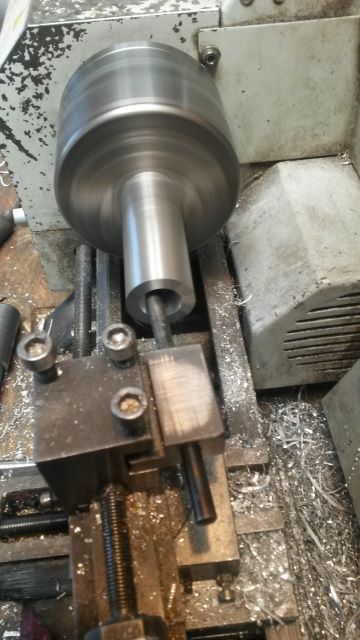 Now, using one of the holes, the blank gets bolted to an arbour to machine the conical outside radius.