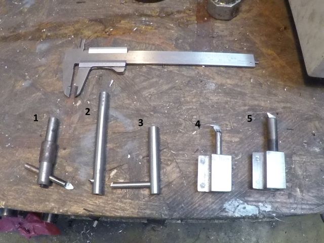 “4” and “5” are boring bar holders for the lathe. I made them from leftover steel blocks. One holds 6mm cutters made from drill rod, the other holds 10mm cutters or can be combined with “2” or “3”.