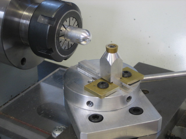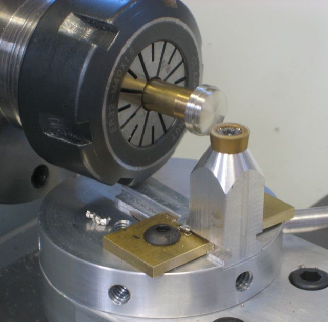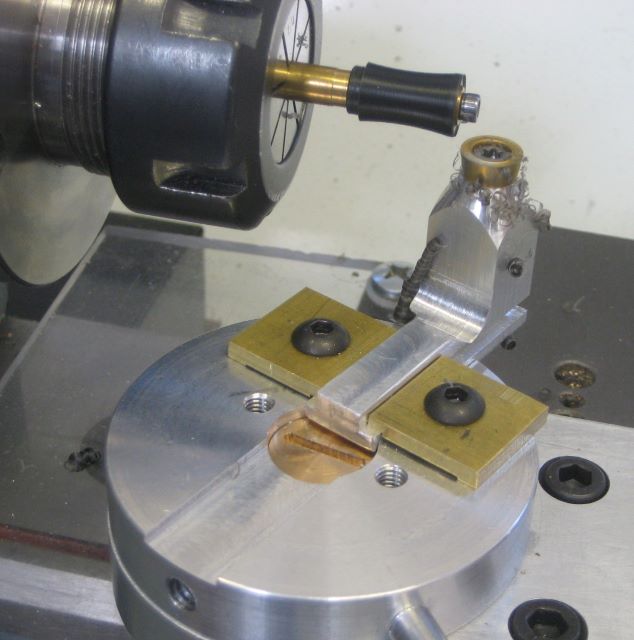 My “standard” bronze frame reel has two surfaces that are cut to a spherical shape, one is the spool retaining screw head (convex) and the other is the waist on the knob (concave; at least, concave motion of the cutter). When I had a Sherline mill I could use it as a lathe by turning the headstock 90 degrees and mounting the cutter to a rotary table. But now I have the more robust Mini Mill, and axis of the headstock can only be vertical. It is still possible to turn, but it seems quite awkward.