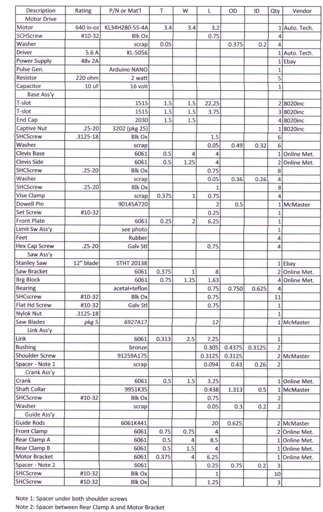 1. The frame for the saw blade is from a Stanley hand saw (STHT20138). The additional bow under blade tension is appreciable and must be considered when drilling holes in the mounting brackets, i.e., have the blade under tension when you spot the hole locations.