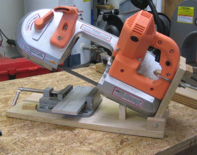 Before milling or turning, stock typically needs to be cut to length. My first tool for this task was a handheld power bandsaw lashed to a plywood frame.