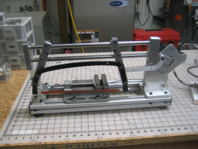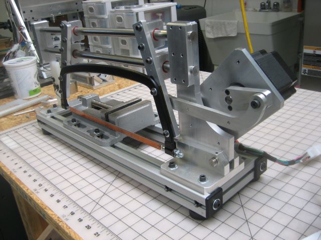 Update 15 Oct 2019: I have removed several previous updates concerning stall problems with the hacksaw. Problem turned out to be misalignment of the linear bearings causing jam. Every time I loosen/retighten the blade, I have to realign. Four bearing blocks are held by 2 screws each; loosen and retighten these to realign.