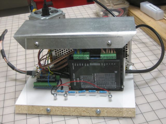 The motor control: a 48 volt supply, a step motor driver, and an Arduino Nano to generate pulses at a ramping rate.