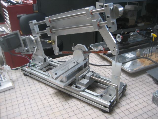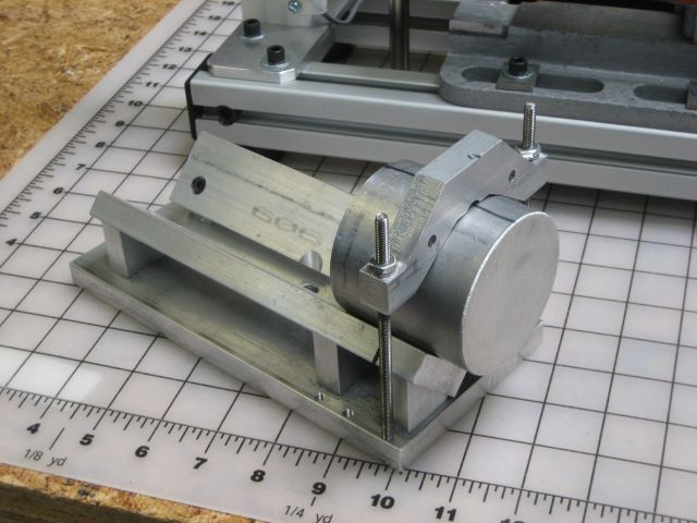 3. The base is made from 1.5 x 1.5 inch “T-slot” material. Guide rails are 5/8 diameter steel shaft.