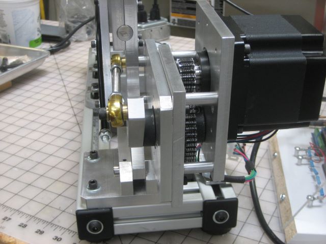 What is different in my design is the use of a large (NEMA 34) stepper motor. This avoids the cost of a gearmotor and the complexity of two stages of belt drive.
