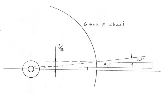 Here is a sketch of the grinding geometry. I have made a 1/8 inch thick plate to set on top of the tool rest. If I hold the bit flat against this plate, the relief angle of the grind is asin(0.125 / 3.0) = 2.4 degrees at the bottom of the bit. (3.0 is the wheel radius.) But at the top of the bit, 1/4 inch higher, the relief angle is asin(0.375 / 3.0) = 7.2 degrees. This is the effective relief angle at the cutting edge.
