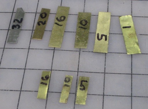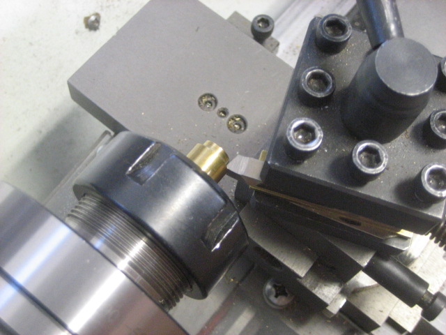 This is the Minilathe standard tool post. I use 1/4 inch bits in it, which need at least 0.082 inch shim. The greatest part of this shim pack is in a brass part with a step that provides an alignment edge. The step width is set to locate the bit under the clamp screws.