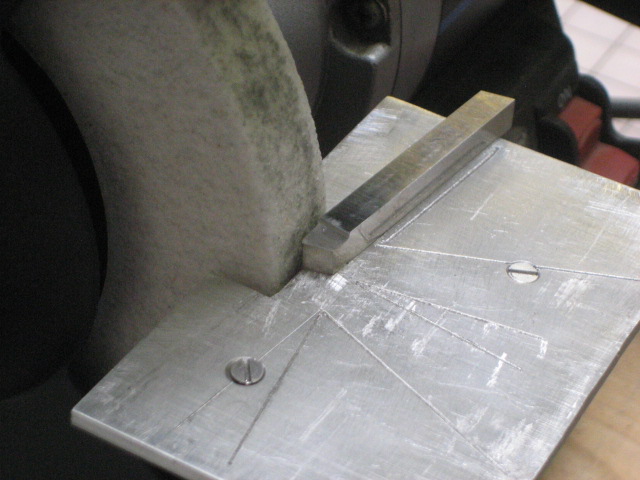 Finally, grind the top of the bit, again holding the bit flat on the cover plate. The Back Rake Angle is 10 degrees and the Side Rake Angle is about 7.2 degrees at the cutting edge.