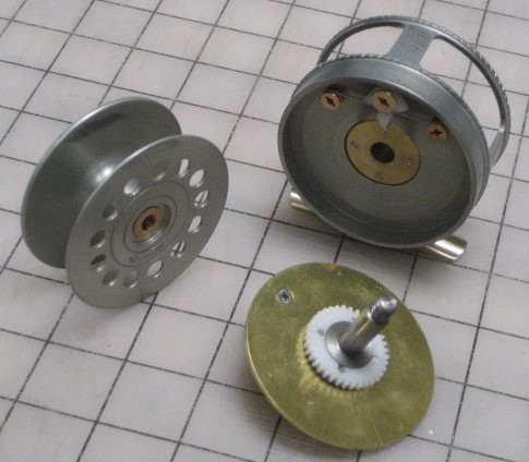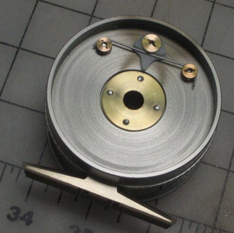 If the reel is palmed, then axial thrust is in the direction that the thrust assembly does not support. On a Hardy reel, this load is taken by a small area of spool aluminum running on the end of the frame bushing. Here, the bronze spool insert runs against the bushing.