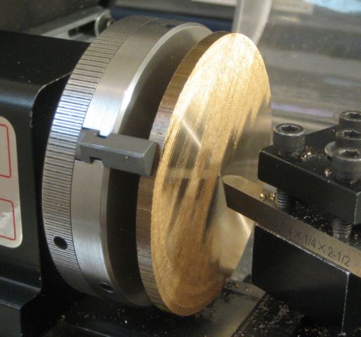 The last consideration was making a thin (.110 inch) disk as the blank for the front end ring. To do this with the Sherline lathe I bought soft jaws for the 3 jaw chuck. The jaws step was .080 inch and that was enough to firmly hold the disk.