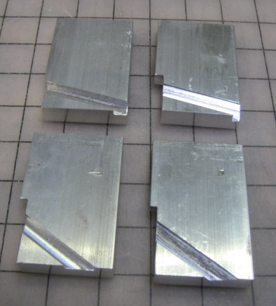 Update 28 Oct 2020: Here are the four holders for grinding tool top surfaces. All are 15 degree side rake (per the sketches above). The front two are 35 degree back rake for aluminum and the back two are 15 degree back rake for steel. The notches at one corner are needed for clearance from the wheel.