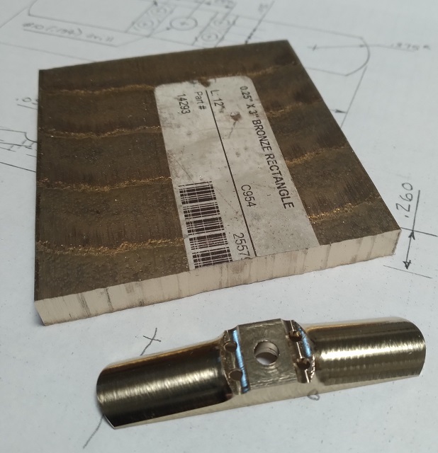 Bronze alloy C954 is supplied as a casting, made by the “continuous casting” method. The cast bar is quite uniform and is oversize; this 1/4 x 3 inch nominal bar measures 0.34 x 3.07. That is so it will clean up to at least 0.25 x 3.00. In my experience, it would have clean surfaces at 0.32 x 3.05. A bar of nominal 2 – 1/2 width is easily wide enough to make a 2.50 long reel foot.
