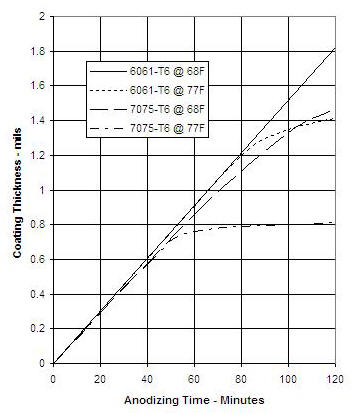 Anodize layer growth depends somewhat on the alloy. The plot below shows the growth in two common alloys, for two different temperatures. For alloy 7075, a small increase in temperature increases the rate of acid dissolution enough to stall out growth at 0.0008 inch.