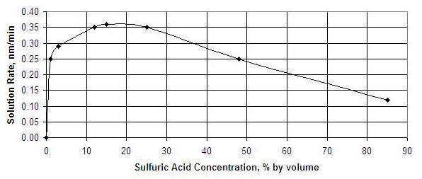 What is special about 15 to 20% concentration (by volume) of the acid? Wouldn’t it be possible to increase the concentration and also increase the current density and get a faster growth of the anodize layer? The answer is no. Surprisingly, the effectiveness of the acid will decrease at higher concentration. The figure below shows dissolution rate of the oxide layer as a function of acid concentration. A concentration rate of 15 to 20 % produces the greatest dissolution. I assume that concentrations outside this peak range run the risk of not maintaining open pores.