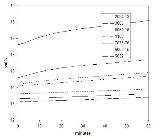 The first plot shows anodize layer growth rate for a current density of 12 amps/square foot. At half this density, I still get an insulating coating but I cannot say how thick. A better policy is to use the current density for which growth rate is known.