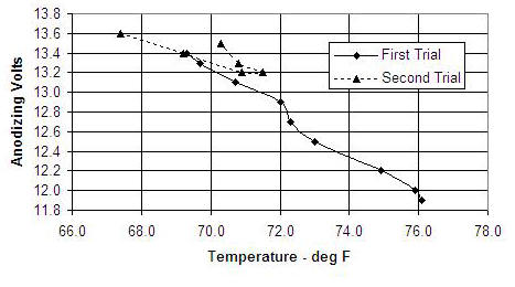 I think that the best policy is to use a lab type power supply with an adjustable current limit and run under constant current control rather than constant voltage. An advantage of this strategy is that the resulting cell voltage is a sensitive indicator of acid solution temperature. Below is some data that I took while anodizing spool ends. In the first trial, I started with acid that was warmer than I wanted (approx. 67 F). I cooled the cell by placing it in a cold water bath, and the voltage gradually increased. At the start of the second run the acid was below 68 F. It warmed during the process (decreasing the voltage) until the water bath was able to cool it again.