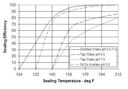 In my first anodizing efforts, I used a “sealant” sold by Caswell (nickel acetate). This now appears to me to be unnecessary, at least for undyed parts. For dyed parts, the sealant may combine with dye molecules to form an additional pore closing agent. Another aspect of the sealant is that it reduces the need for pure water in the sealing process. The chart below depicts a “sealing efficiency” quantity that is determined by dye staining trials on a sealed surface.