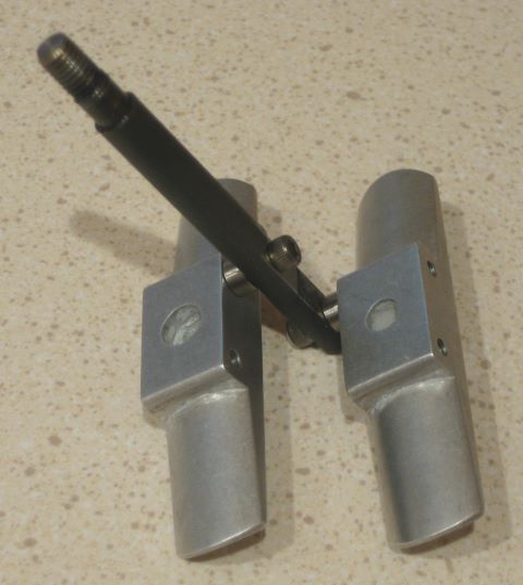 A jig can also be made from titanium. You will hear tales of how difficult it is to machine titanium, but such stories are about high strength/hardness titanium alloys. Grade 2 titanium is “commercially pure” and not difficult to machine. I have made several jigs of Grade 2 rod. Below is the jig for a reel end plate. The end plate is fastened to the jig using a titanium alloy cap screw. Titanium does not develop an insulating coating and can be re-used without stripping. When doing spool plates, I have a jig that clamps on a feature on the back of the plate, and this feature is hidden in the final assembly of the reel. The point of contact between jig and workpiece of course receives no anodize layer, and should be carefully chosen.