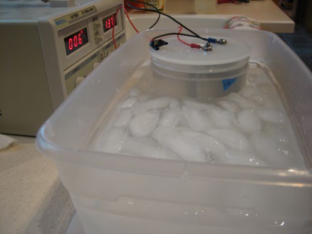 The water bath measures about 35 deg F. I figure that the heat generation in the cell is 20 watts (1.45a * 14v) electric plus 5 watts (140 BTU/ft^2/mil) exothermic heat of formation, or a total of 25 watts. The polypropylene wall of the cell is 0.062 inch thick, and the area of contact with the water bath is a cylindrical surface 4.5 inches diameter and 2.5 inches high. Taking the thermal conductivity of polypropylene to be 0.12 W/(m * deg C), the wall thermal resistance is about 1.0 (deg F)/W. The overall thermal resistance is evidently (37 deg F)/(25 watts) = 1.5 (deg F)/W, so convection coefficients in the water bath and in the acid solution have some effect. So 1.5 amps is the limit for anodizing in this cell, unless I take further measures to promote heat transfer.