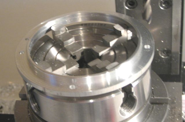I made these from cut-offs of a 3.5 inch diameter Delrin rod (On Line Metals). But I now think that sheet material would be better starting point. Grip a square of the sheet in the 4 jaw chuck, partly round off the corners with a mill (to gain clearance when you move to the lathe), rough out the rear end plate cavity on the mill, then finish on the lathe. Take care to get the OD and 5/16 bore as concentric as possible. You probably cannot do both with the same chucking, so use your “Last Word” indicator to get centered again when re-chucking.