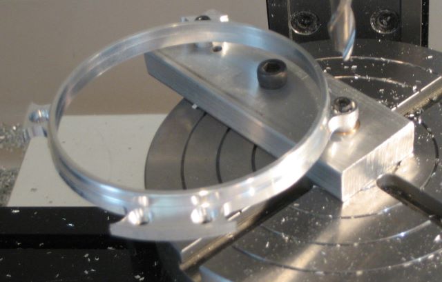 This design can be made from the same hollow tube used for the round rings, but it is tight fit. Raw material should be centered when first chucked. I have already devoted one blog post to making this part. A new design under consideration is very similar, and may generate another post. As for the S shaped crank, take the last 0.010 off the edges with a single full depth pass of the mill.